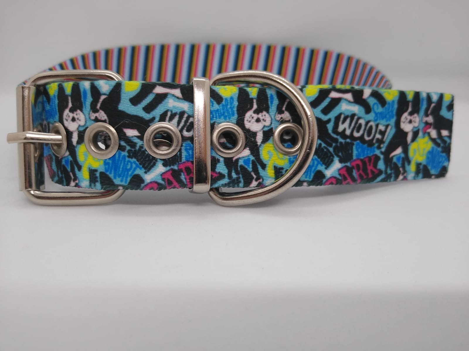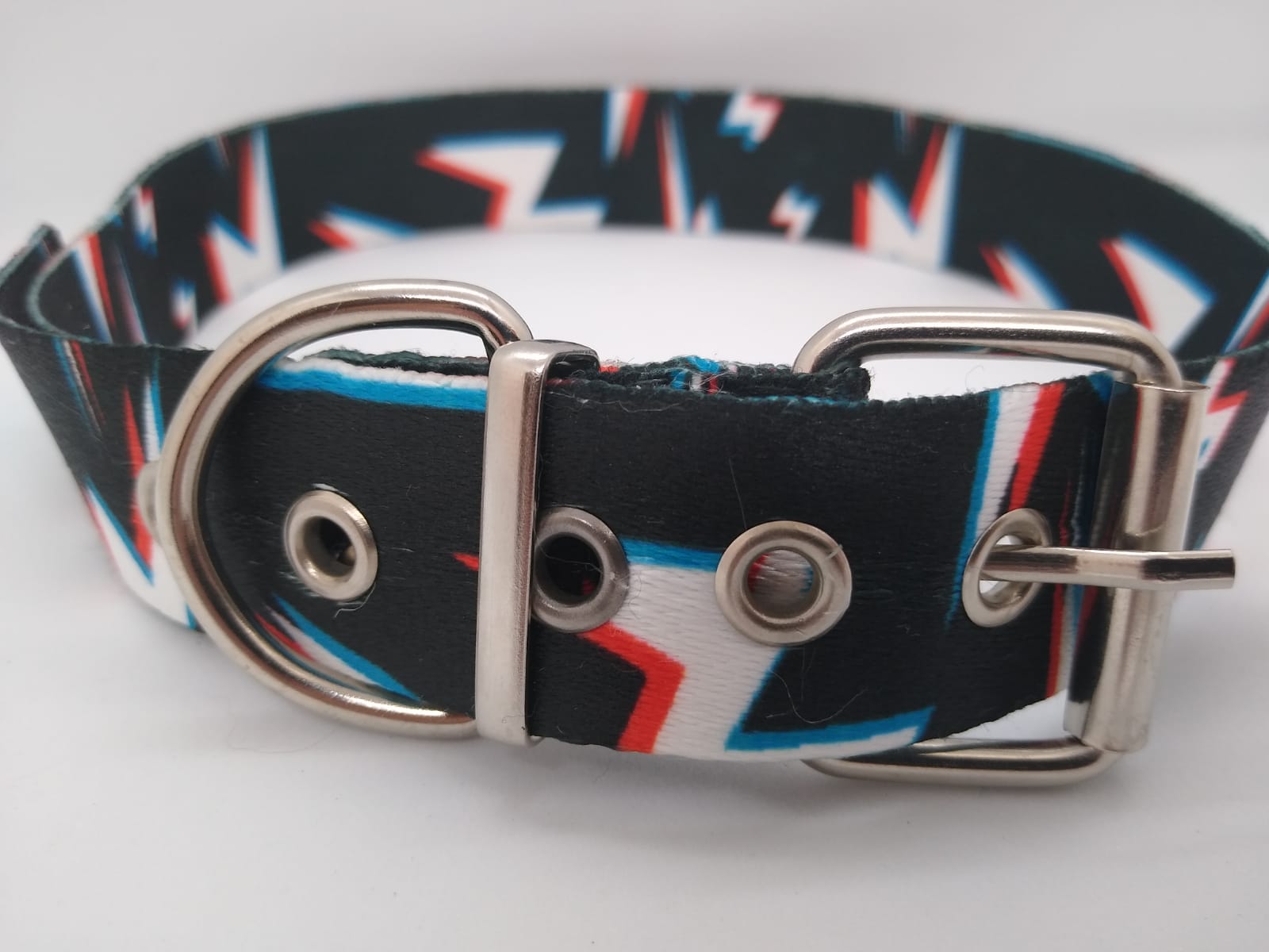 Collar fabricado con cinta de Poliéster y Polipropileno de alta resistencia y herrajes de níquel, reforzado con remaches importados para máxima durabilidad y seguridad